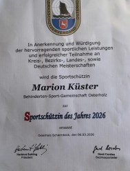 Auf der Delegiertenversammlung des Bezirksschützenverbandes Osterholz am 6.3.2026 in Grasberg wurde Marion für Ihre langjährigen, guten sportlichen Leistungen auf Bezirks-, Landes- und Deutschen Meisterschaften geehrt und hierfür zur Sportschützin des Jahres 2026 gewählt.